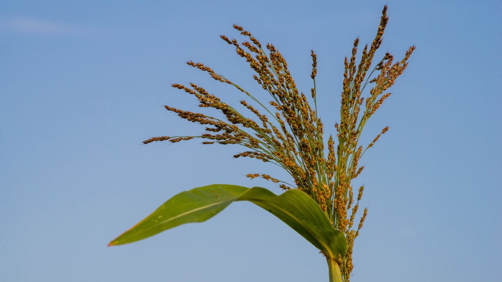 Next, the panicle, or a cluster of flowers, that will form the seed head begins to grow within a sheath of leaves. As the plant matures, the head emerges from the sheath and turns from green to gold to brown. Millet is typically harvested for the highest yield when the head has turned a third of the way brown.