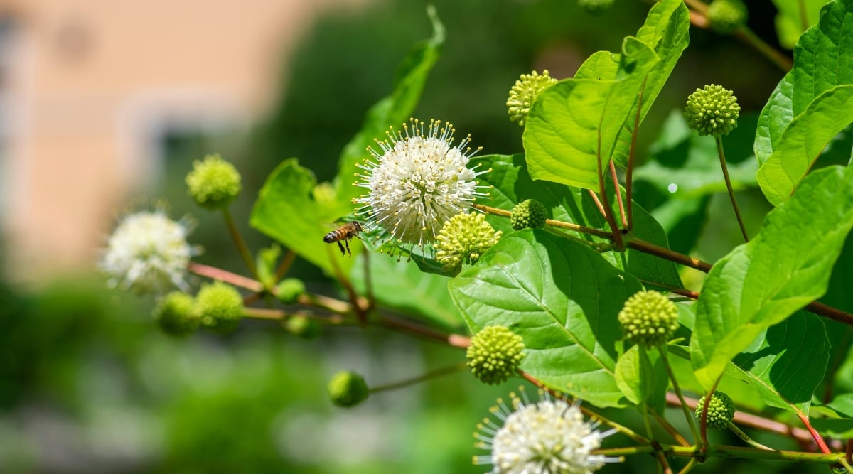 Buttonbush blooms in early to mid-summer. The flowers are spherical white orbs, like little pincushions or fluffy snowballs. The highly fragrant flowers attract hummingbirds and many butterflies, bees, and other pollinators. After flowering, round, reddish-brown seedheads adorn the shrub, lasting into the autumn months.