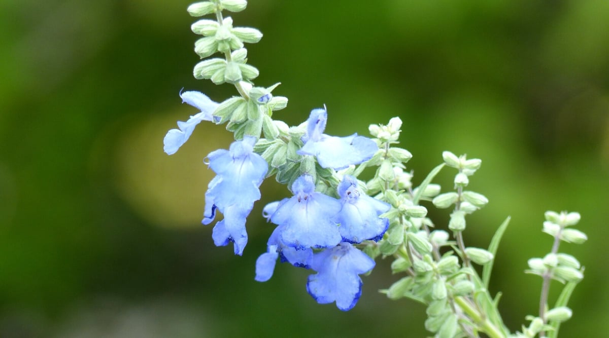 The flowers of blue sage are pale purplish-blue. They grow in loose spikes and bloom from mid-summer through mid-fall. The flowers are showy and attract both hummingbirds and butterflies. Removing spent flower stalks can help prolong the blooming period, and if flower stalks grow long and top-heavy, use stakes or cages to help keep them upright.