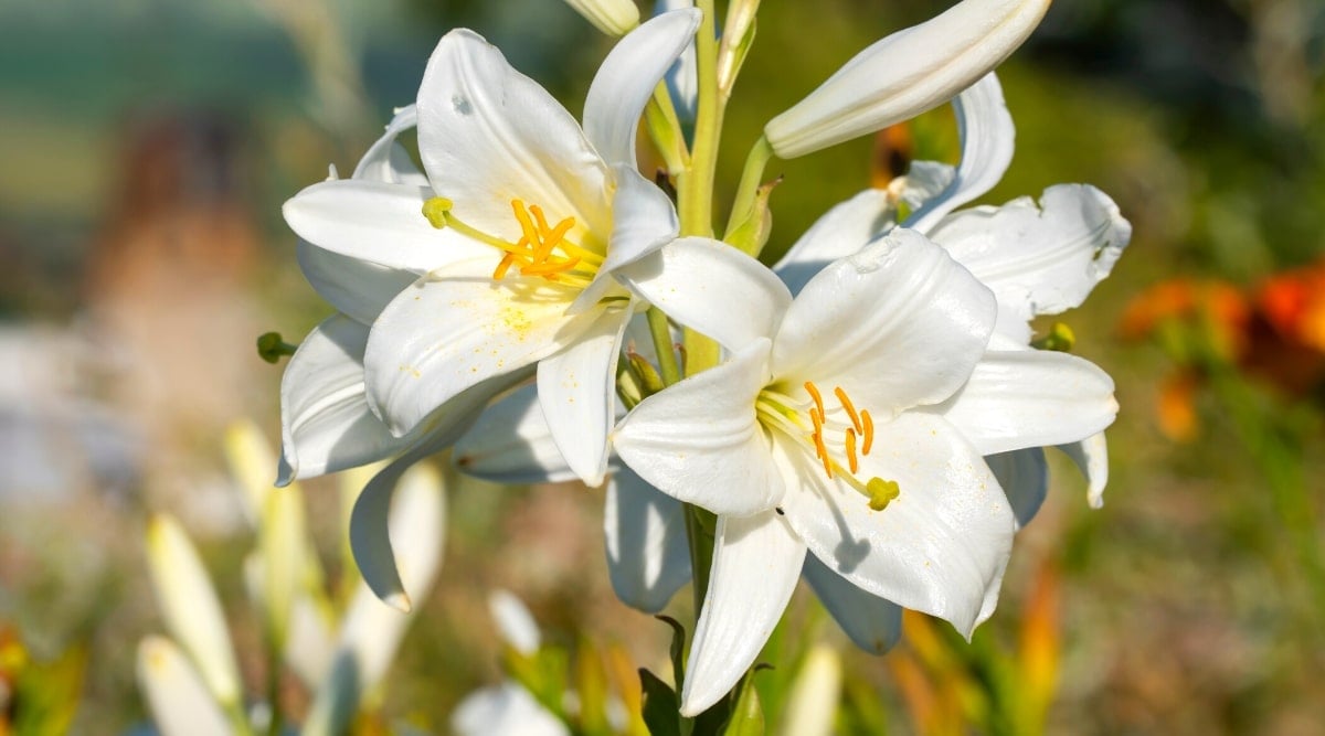 Flowers in this group are typically pure white and oversized at 6 to 7 inches wide. Blooms are trumpet-shaped and face outward, but not downward, like a pendant. Easter lilies are popular gifts and are most commonly featured in containers, but they can be grown directly in the soil as well.