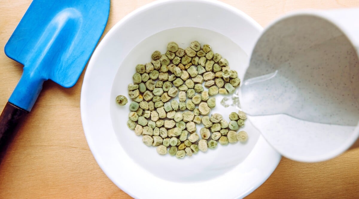 The day before you plan to sow peas, soak them for 8-12 hours. Adding inoculant during this process may speed up the germination process even more. The peas will plump up and be less wrinkled. Discard the floating peas and drain the water.