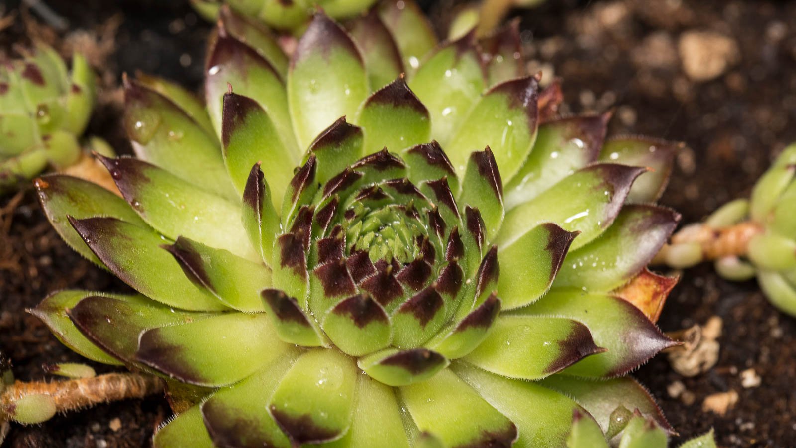 These attractive houseleeks are a stunning black and dark green combo that, like any hen and chick, forms new little plantlets all the time. The thin, pointy leaves form a rosette that darkens in color as the weather gets colder.