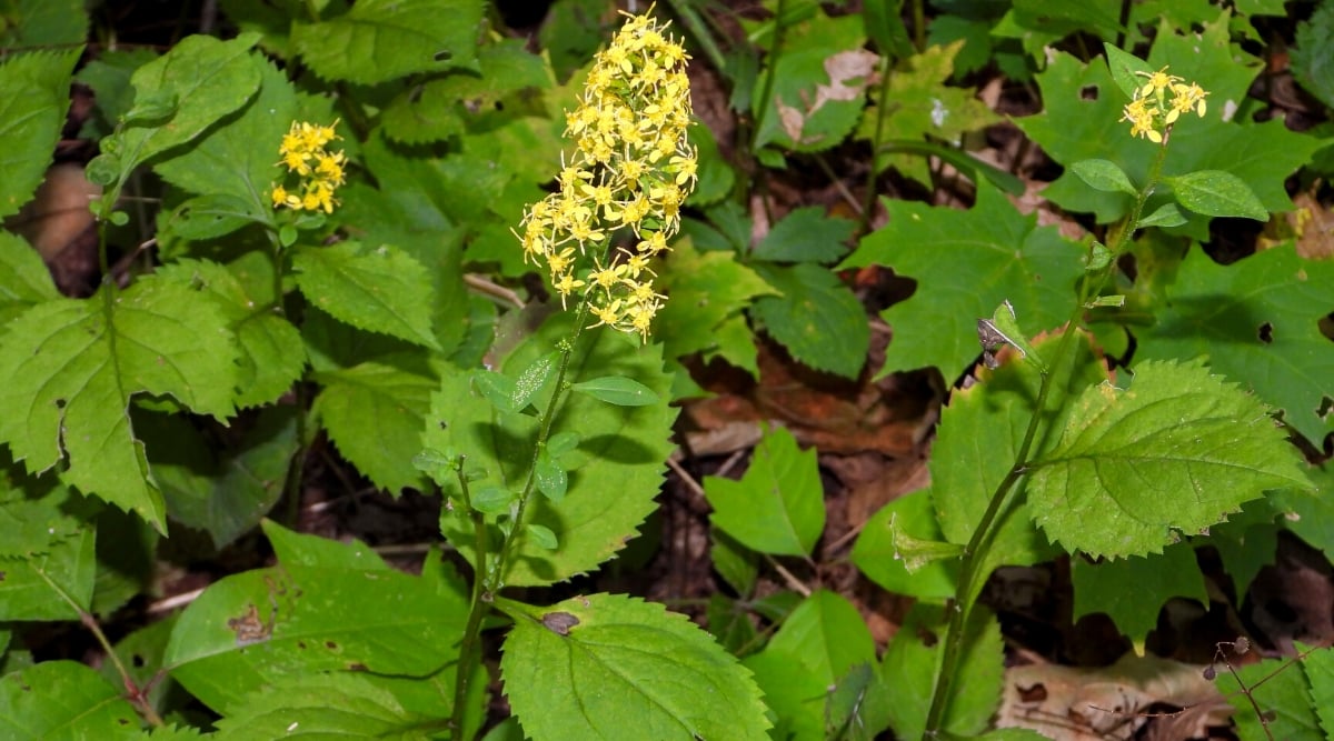 Zigzag goldenrod has broad leaves with densely ridged edges. The flowers bloom from mid-summer until early fall. There are a few small clumps of flowers along the upper parts of the leafy stems, with a loose spike of yellow flowers at the top. This is a clump-forming plant that will look best if allowed to develop into small clusters.