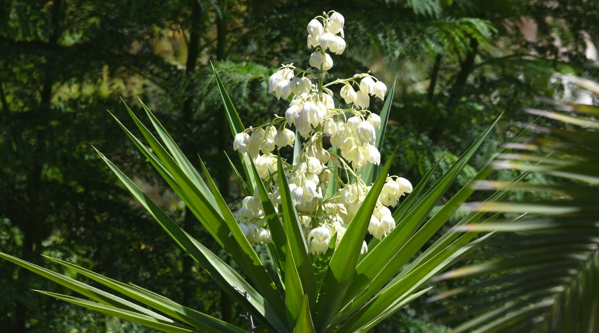 The iridescent quality of yucca blooms is striking in any landscape. The plants are impeccably drought tolerant and have adapted to survive extremely hot, harsh, dry conditions. The deep root systems can break through tough soils, and the fleshy root structures store water to keep the plant hydrated during the fire season.
